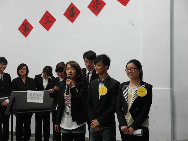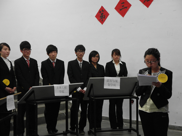此次比賽分必答題,演講題,風(fēng)險(xiǎn)題和視聽(tīng)題四個(gè)環(huán)節(jié)。城建學(xué)院,建筑與規(guī)劃學(xué)院,土木工程學(xué)院,交通學(xué)院,管理學(xué)院,公共藝術(shù)學(xué)院,電氣信息學(xué)院七個(gè)代表隊(duì)在四個(gè)環(huán)節(jié)中決出勝負(fù),整個(gè)現(xiàn)場(chǎng)氣氛緊張而活潑,現(xiàn)場(chǎng)掌聲接連不斷。每個(gè)階段各參賽隊(duì)伍毫不示弱,他們的精彩表現(xiàn)贏得同學(xué)們一次又一次的喝彩歡呼。經(jīng)過(guò)激烈角逐,最終城建學(xué)院奪得桂冠,獲得團(tuán)體一等獎(jiǎng),建筑與規(guī)劃獲學(xué)院獲得團(tuán)體二等獎(jiǎng),管理學(xué)院獲得團(tuán)體三等獎(jiǎng)。