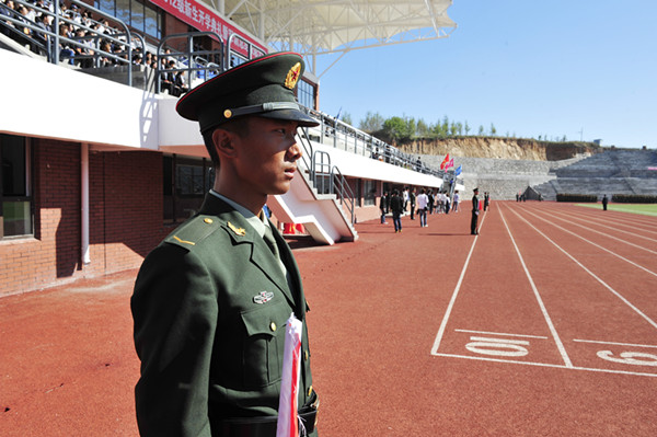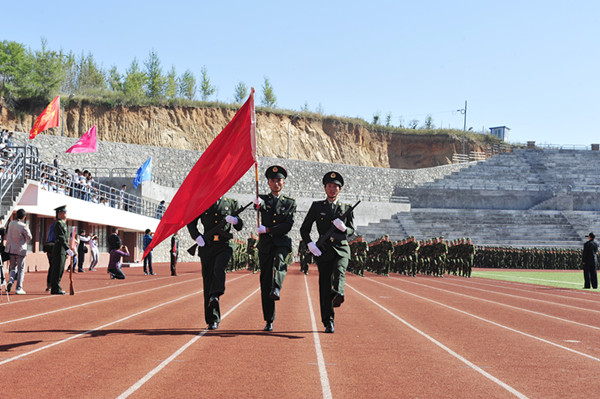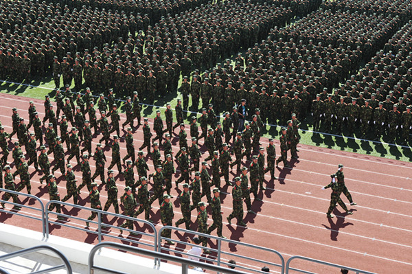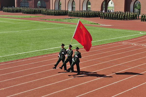 9點(diǎn)30分,在雄壯的中華人民共和國(guó)國(guó)歌聲中,大會(huì)拉開序幕。大會(huì)首先由2012級(jí)學(xué)生軍訓(xùn)團(tuán)團(tuán)長(zhǎng)邵志文主持閱兵式,校長(zhǎng)石曙光在軍訓(xùn)團(tuán)團(tuán)長(zhǎng)邵志文的陪同下檢閱了2012級(jí)新生軍訓(xùn)方隊(duì),向參訓(xùn)的學(xué)生和教官致以親切的問候。新生們神采飛揚(yáng),“同學(xué)們好”、“首長(zhǎng)好”、“同學(xué)們辛苦了”、“為人民服務(wù)”的口號(hào)聲此起彼伏,響徹校園上空,經(jīng)久不息。隨后,伴隨著激昂的《中國(guó)人民解放軍進(jìn)行曲》,分列式表演正式開始。由2700多名2012級(jí)新生組成的24個(gè)軍訓(xùn)方隊(duì),以飽滿的精神、整齊有力的步伐,充分展示了當(dāng)代大學(xué)生良好的精神風(fēng)貌,體現(xiàn)了本次軍訓(xùn)的豐碩成果,受到了參會(huì)領(lǐng)導(dǎo)的高度贊揚(yáng)。