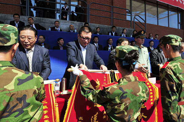 最后,校長(zhǎng)石曙光教授發(fā)表了熱情洋溢的講話。他首先代表學(xué)校對(duì)全體新生表示熱烈歡迎和衷心祝賀。向擔(dān)任2012級(jí)新生軍訓(xùn)任務(wù)的第16集團(tuán)軍防化營(yíng)洗消連的全體承訓(xùn)教官表示最誠(chéng)摯的謝意。石校長(zhǎng)向2012級(jí)新生介紹了我校發(fā)展情況,并提出三點(diǎn)希望:一是牢記使命,立志成材,盡快學(xué)會(huì)自理、自立;二是奮發(fā)學(xué)習(xí)、和諧發(fā)展,盡快學(xué)會(huì)自我學(xué)習(xí)、自覺學(xué)習(xí);三是勇于進(jìn)取,敢于創(chuàng)新,努力學(xué)習(xí)專業(yè)知識(shí)。最后他號(hào)召全校師生攜起手來,共同助推學(xué)校朝著創(chuàng)建國(guó)內(nèi)一流民辦大學(xué)的目標(biāo)努力奮進(jìn)。