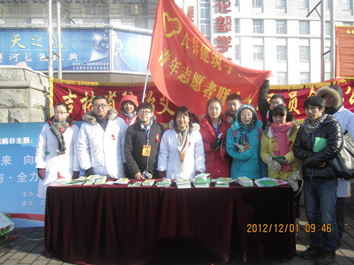 12月1日7點,我校青年志愿者聯合會的成員及土木工程學院、電氣信息學院、建筑與規劃學院各派一名志愿者代表前往長春市人民廣場,參與由長春市計生委舉辦的艾滋病宣傳活動。在寒冷的天氣中,我校青年志愿者們在路旁為路人發放艾滋病宣傳資料,并為他們講解預防艾滋病的相關內容。此舉得到了有關部門領導的表揚,認為這些志愿者為當代大學生樹立了好榜樣。活動期間,長春日報記者對我校青年志愿者聯合會主席景源進行了采訪,同時對志愿者們的表現提出表揚,表示要一同呼吁越來越多的大學生都參與到防抵艾滋病的活動中去,構建更加健康和諧的社會。