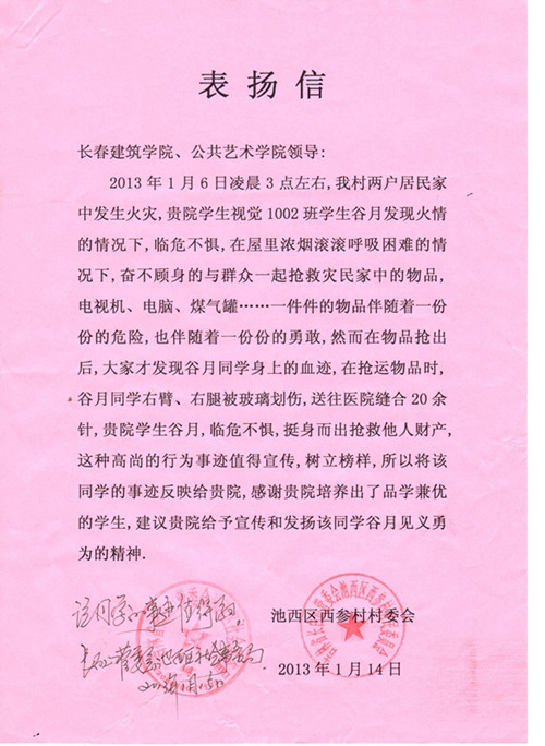 近日,我校收到長白山管委會池西區西參村村委會寄來的一封表揚信,信中對我校藝術學院視覺1002班學生谷月臨危不懼,在大火中搶救他人財物的見義勇為行為給予了高度贊揚和感謝。