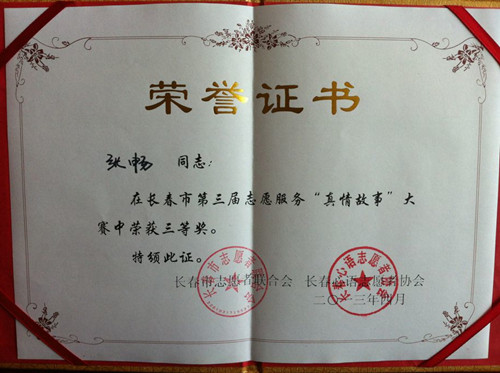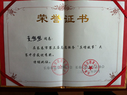 為了讓更多的人懂得志愿服務的真諦,加入到志愿服務的行列。4月20日,由長春市志愿者聯合會、長春心語志愿者協會共同舉辦的第三屆志愿服務“真情故事”大賽決賽,在長春市金悅賓館落下帷幕,我校青年志愿者聯合會志愿者張暢同學榮獲三等獎、董夢夢同學榮獲優秀獎。