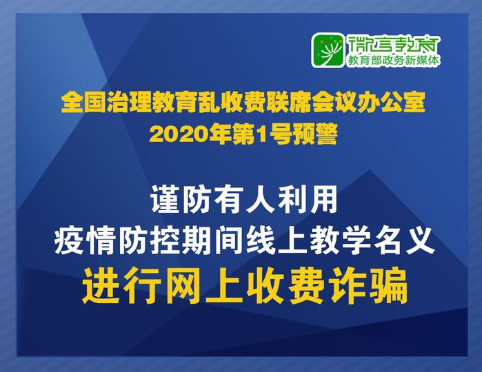 2月17日,教育部網站發布《全國治理教育亂收費聯席會議辦公室關于謹防有人利用疫情防控期間線上教學名義進行網上收費詐騙的預警(2020年第1號預警)》。