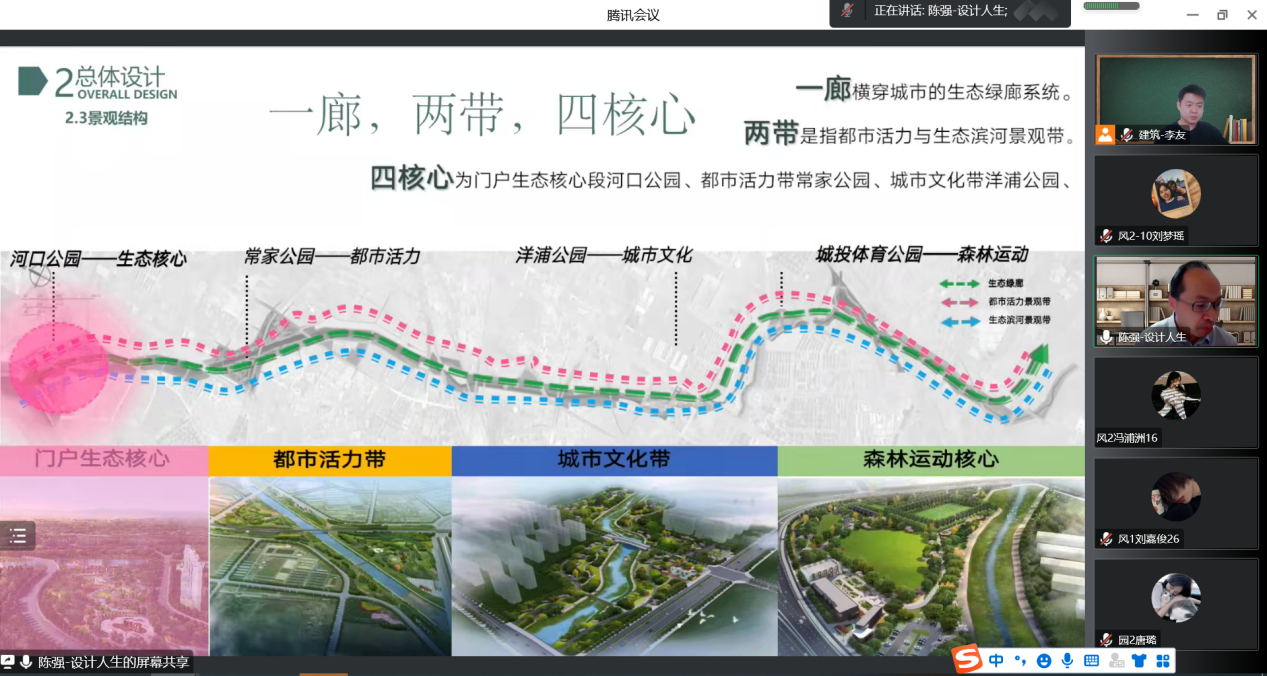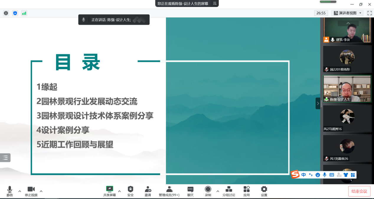 在講座中,陳強總監從緣起、園林景觀行業發展動態交流、園林景觀設計技術體系案例分享、設計案例分享、近期工作回顧與展望五個方面與師生們進行了深入的交流。作為首席景觀設計總監,他曾榮獲建設部中國人居環境范例獎、國家優質工程獎、全國生態智慧與城鄉實踐大賽一等獎等多項重要獎項,并榮獲國際園林景觀設計大會杰出中青年景觀規劃師獎。他結合設計實踐中的體會,特別為師生們解讀并展望了園林景觀行業新的增長點等熱議話題。