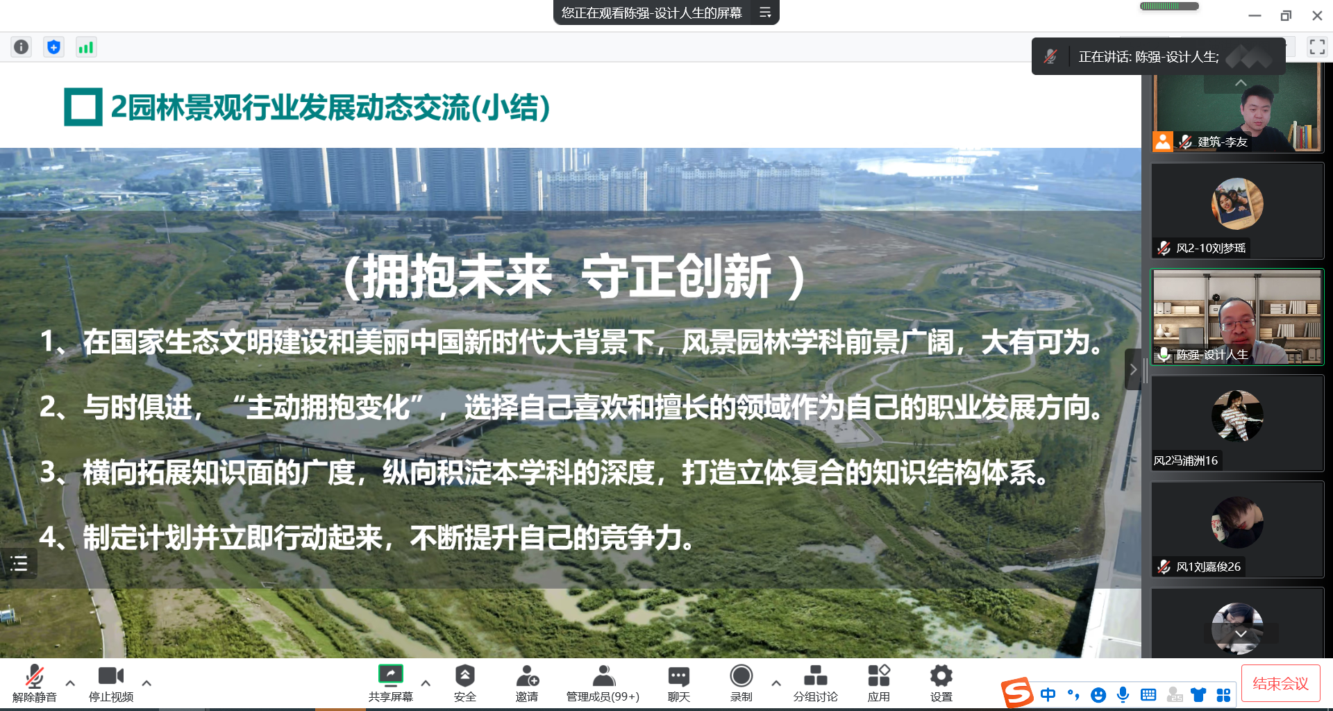 李友主任在總結中感謝陳強總監的講座拉近了師生與行業的距離。他強調風景園林與園林專業的同學們將扎實做好規劃,明確自身的專業發展方向,發現自己的興趣所在和擅長的專業領域,為日后學習、工作打下堅實基礎,為未來我國人居環境建設貢獻自己的力量。