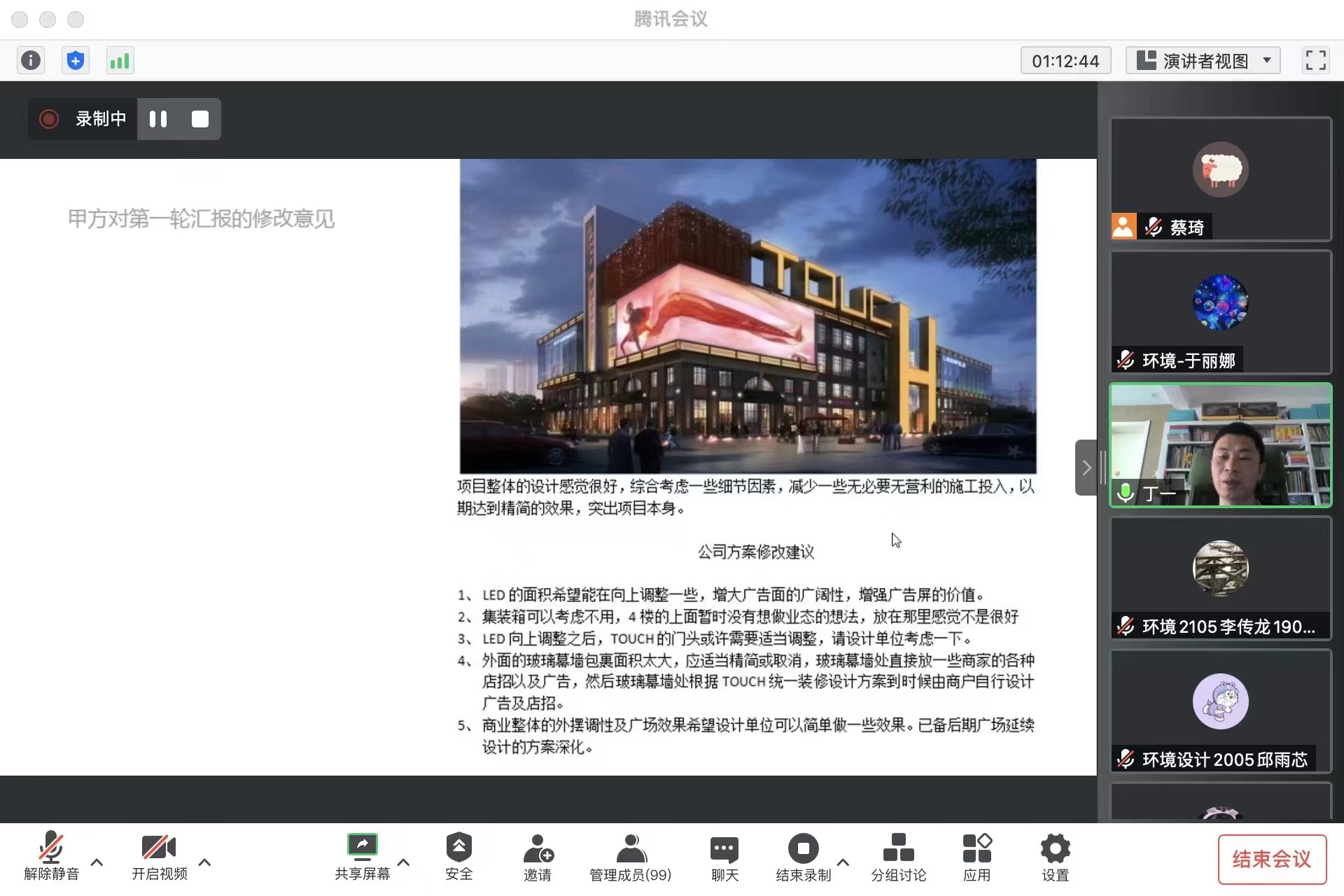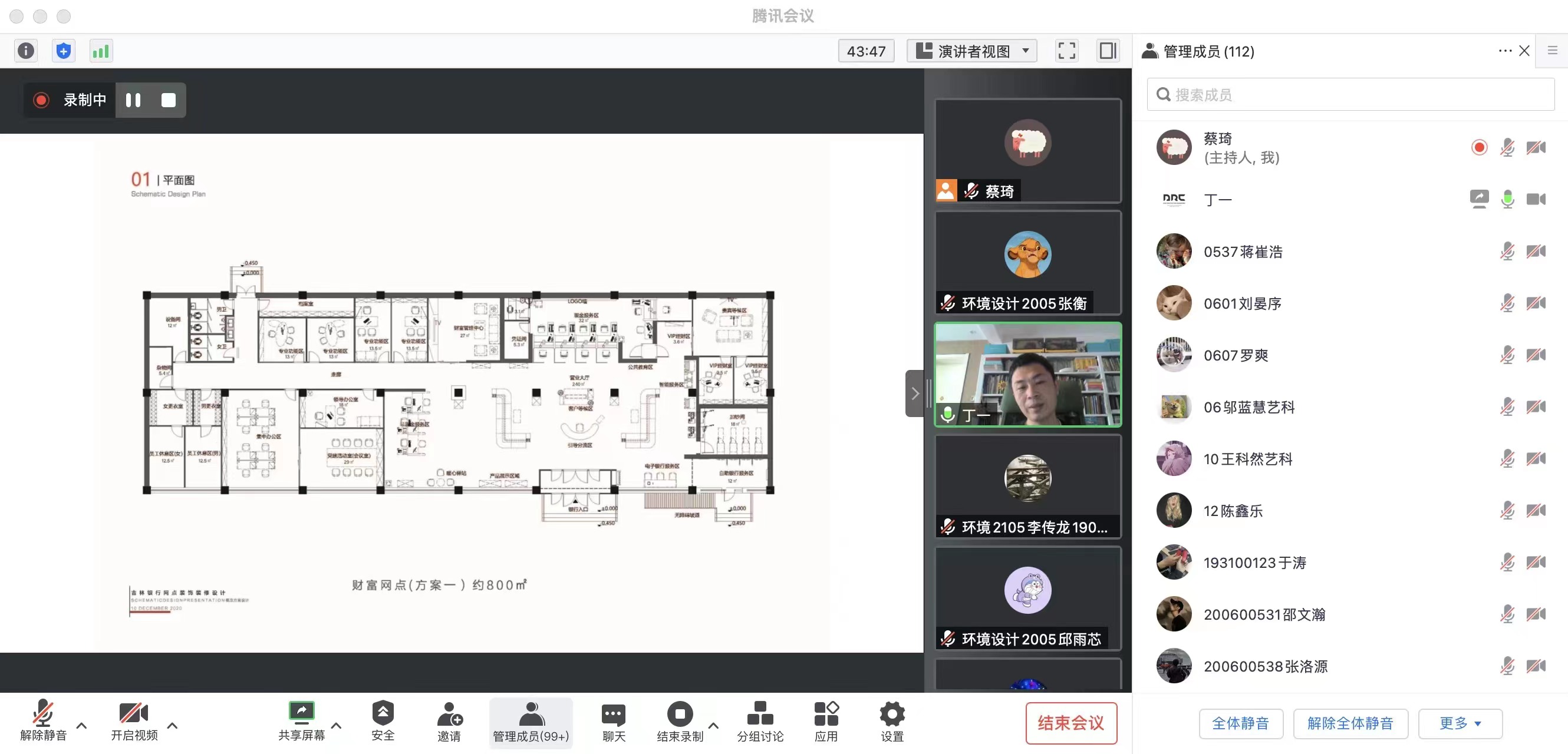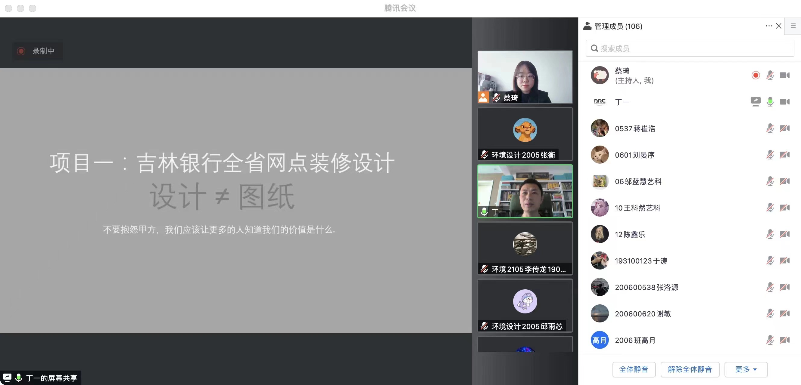 為了有效提升師生們對建筑空間結構設計的理論和技術實踐水平,丁一老師結合各種建筑空間結構的發展現狀和典型工程案例,對建筑空間結構的關鍵理論、結構體系、新材料等進行分類梳理,并介紹了相應的工程實例。通過對吉林銀行室內裝飾設計、TOUCH十二街建筑外立面設計、長春科技大市場展廳設計、雙陽虹橋醫院建筑設計和奧迪入口廣場景觀設計等項目的分享,深入闡述和解析了工作中的設計方案及設計實施的相關環節。同時,還引導同學們就相關案例的項目背景、設計理念、設計思路、設計方法等環節展開了熱烈的討論。