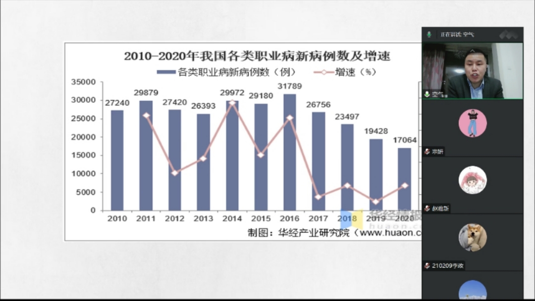 張大秋老師目前負責長春市全市健康企業技術指導、工程防護技術指導等工作,主持完成省部級科研項目1項,完成省級地方標準10余項。他特別從疫情層面強調了國家對國民健康的重視,以頸椎病、胃病,肩周炎等常見職業病為例講解了職業病產生的條件與分類,隨后通過數據統計的方式直觀介紹了近年來職業病的增速以及法律文案的修改完善。強調縱觀職業病防治的發展歷史不難發現各個部門缺一不可,若想加快推進職業病防治技術支撐體系建設,需各級衛生健康行政部門研究確定技術支撐的依托單位及其具體任務。