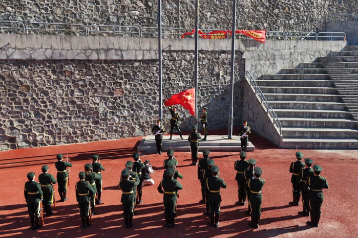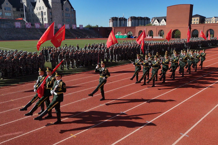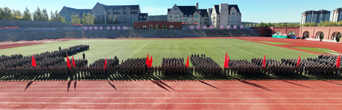 清晨,迎著徐徐微風,國旗護衛隊身著筆挺制服,邁著鏗鏘步伐護送國旗至旗桿下。伴隨著《義勇軍進行曲》激昂旋律,五星紅旗冉冉升起,全體新生肅立行注目禮,嘹亮國歌聲中,愛國情懷激蕩心間。
