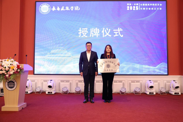 在全場矚目下,孫雷為長春分會授予牌匾與旗幟。新任會長陸其鎂上臺接牌,秘書長薄磊接旗,牌匾代表分會的組織身份,旗幟承載著校友間的凝聚力,此舉也意味著學校在長春地區的校友工作邁入全新階段。